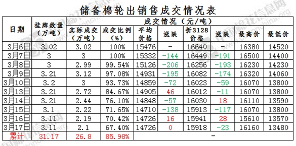 3月17日儲備棉輪出銷售資源31080.422噸,實(shí)際成交20948.569噸,成交率67.40%。當(dāng)日最高成交價(jià)16160元/噸(2012年度新疆棉),最低成交價(jià)13480元/噸(2013年度地產(chǎn)棉)。成交平均價(jià)格14726元/噸(較前一日價(jià)格持平);折3128價(jià)格:15918元/噸(較前一日價(jià)格跌23元/噸)。當(dāng)日單捆最高加價(jià)1520元/噸(2012年度新疆棉),單捆最低加價(jià)20元/噸(2011年度地產(chǎn)棉1捆;2012年度地產(chǎn)棉10捆,新疆棉1捆;2013年度地產(chǎn)棉6捆,新疆棉7捆)。