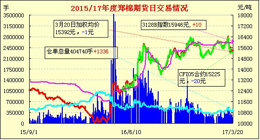 3月20日,隔夜鄭棉CF1705合約下滑,今日早盤反抽回落,午后在空頭賣盤壓制下增倉下跌,日線形成小陰線。日內(nèi)成交量萎縮,持倉量減少?;久媲闆r:從菏澤部分軋花廠了解到,菏澤地區(qū)籽棉資源減少,企業(yè)欲到東營收購。 日前,菏澤部分企業(yè)到東營采購籽棉,但東營籽棉資源也是日益減少,部分棉花企業(yè)籽棉庫存還有百余噸。當(dāng)?shù)刈衙奘召弮r3.65元/斤,試軋衣分35左右,加工出皮棉主體品級能達到4級。如果算上運費,衣分又低,拉回菏澤加工出的皮棉成本在15400元/噸左右。