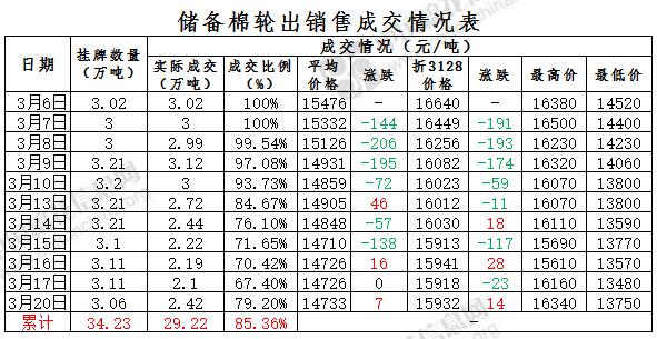 3月20日儲(chǔ)備棉輪出銷售資源30593.966噸,實(shí)際成交24230.962噸,成交率79.20%。當(dāng)日最高成交價(jià)16340元/噸(2012年度新疆棉),最低成交價(jià)13750元/噸(2013年度地產(chǎn)棉)。成交平均價(jià)格14733元/噸(較前一日價(jià)格漲7元/噸);折3128價(jià)格:15932元/噸(較前一日價(jià)格漲14元/噸)。當(dāng)日單捆最高加價(jià)2100元/噸(2012年度新疆棉),單捆最低加價(jià)20元/噸(2011年度地產(chǎn)棉1捆;2012年度地產(chǎn)棉10捆;2013年度地產(chǎn)棉6捆,新疆棉2捆)。