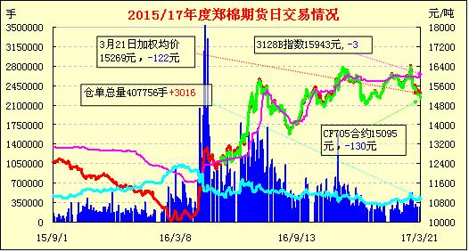 3月21日,隔夜鄭棉CF1705合約震蕩下行,今日早盤慣性下滑后橫盤震蕩,日線形成陰線。日內(nèi)成交量放大,持倉量增加?;久媲闆r:國家發(fā)改委日前發(fā)布《關(guān)于深化棉花目標(biāo)價格改革的通知》,宣布從2017年起,棉花目標(biāo)價格由試點期間的“一年一定”改為“三年一定”。另外,補貼辦法要調(diào)整優(yōu)化,進(jìn)行上限管理,超出上限的不予補貼。2017年至2019年新疆棉花目標(biāo)價格為每噸18600元,和去年持平。