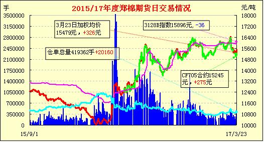 3月23日,隔夜鄭棉CF1705合約在空頭回補推動下回升,今日盤中高位震蕩,日線形成長陽線。日內(nèi)成交量放大,持倉量減少。基本面情況:現(xiàn)貨市場觀望心態(tài)再次增加,目前報價維持,河北等地3128級大包棉提貨價格在15700元/噸毛重,4128級在15300元/噸。山東等地雙28、29級新疆手摘棉價格在16500-16800元/噸,實際商談仍有部分優(yōu)惠,部分紡企延續(xù)隨用隨買策略,相對熱衷于質(zhì)量較好的棉花和進口棉。