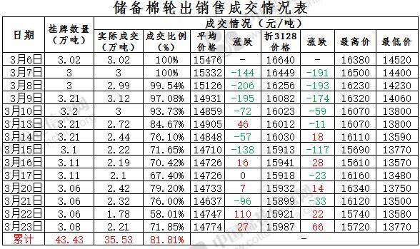 3月23日儲(chǔ)備棉輪出銷(xiāo)售資源30812.607噸,實(shí)際成交22139.925噸,成交率71.85%。當(dāng)日最高成交價(jià)15720元/噸(2012年度新疆棉),最低成交價(jià)13770元/噸(2012年度地產(chǎn)棉)。成交平均價(jià)格14774元/噸(較前一日價(jià)格漲27元/噸);折3128價(jià)格:15987元/噸(較前一日價(jià)格漲66元/噸)。當(dāng)日單捆最高加價(jià)1300元/噸(2013年度新疆棉),單捆最低加價(jià)20元/噸(2012年度地產(chǎn)棉7捆;2013年度地產(chǎn)棉2捆,新疆棉2捆)。
