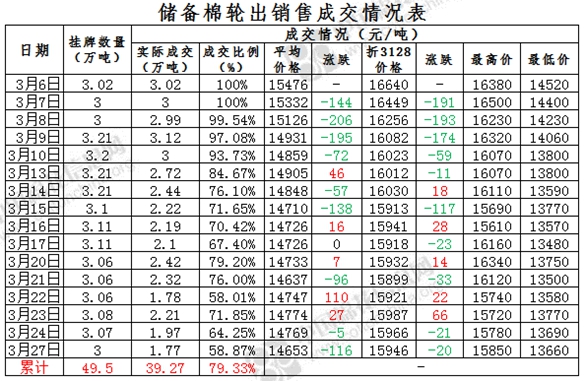 3月27日儲備棉輪出銷售資源30043.263噸,實際成交17687.415噸,成交率58.87%。當日最高成交價15850元/噸(2012年度新疆棉),最低成交價13660元/噸(2013年度地產棉)。成交平均價格14653元/噸(較前一日價格跌116元/噸);折3128價格:15946元/噸(較前一日價格跌20元/噸)。當日單捆最高加價2000元/噸(2013年度新疆棉),單捆最低加價20元/噸(2011年度地產棉1捆;2012年度地產棉8捆,新疆棉3捆;2013年度地產棉7捆,新疆棉3捆)。