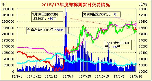 3月28日,隔夜鄭棉CF1705合約上試回落,今日早盤在空頭回補(bǔ)推動下一度沖高,午后在平倉盤壓制下回落,日線形成陽線星。日內(nèi)成交量萎縮,持倉量減少?;久媲闆r:“清明”臨近,正是蘇北棉區(qū)適期趕制棉花育缽時(shí)期,往年棉農(nóng)爭取“明前苗”。然而,走遍蘇北南通、鹽城等傳統(tǒng)棉區(qū),卻幾乎見不到備床制缽的棉農(nóng),縱然問及少數(shù)棉農(nóng)今年的植棉意向,回答多數(shù)擬在自家跟隨瓜果蔬菜同床育苗。這種現(xiàn)象反映出,當(dāng)?shù)刂裁廾娣e在萎縮。