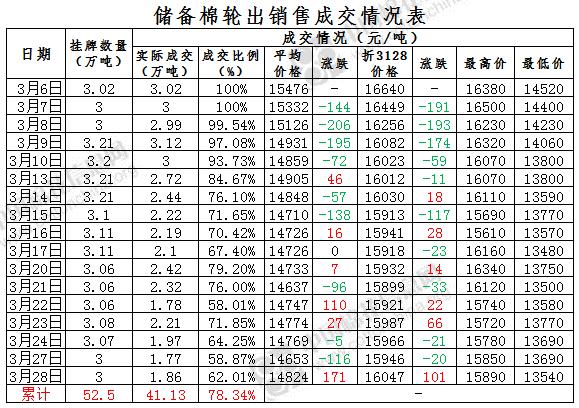 3月28日儲備棉輪出銷售資源30044.554噸,實際成交18629.315噸,成交率62.01%。當日最高成交價15890元/噸(2012年度新疆棉),最低成交價13540元/噸(2013年度地產棉)。成交平均價格14824元/噸(較前一日價格漲171元/噸);折3128價格:16047元/噸(較前一日價格漲101元/噸)。當日單捆最高加價2040元/噸(2012年度新疆棉),單捆最低加價20元/噸(2012年度地產棉6捆;2013年度地產棉5捆,新疆棉2捆)。