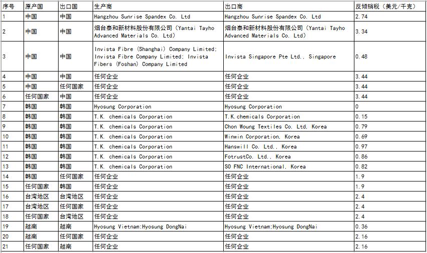 2017年3月24日,印度商工部發(fā)布公告稱,對進口自中國大陸、臺灣地區(qū)、韓國、越南的彈性紗線(ElastomericFilamentYarn)作出反傾銷終裁,建議對中國大陸、臺灣地區(qū)、韓國和越南的涉案產(chǎn)品分別征收0.48~3.34美元/千克、2.40美元/千克、0~1.90美元/千克、0.36~2.16美元/千克的反傾銷稅,詳見下表。涉案產(chǎn)品的印度海關(guān)編碼為54041100。