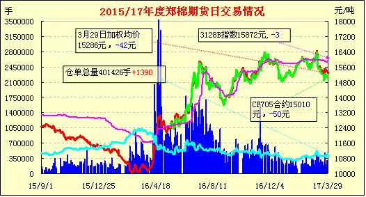 3月29日,隔夜鄭棉CF1705合約探低回升,今日盤中震蕩下滑,日線形成小陰線。日內(nèi)成交量變化不大,持倉量減少。基本面情況:現(xiàn)貨市場(chǎng)弱勢(shì)調(diào)整,國儲(chǔ)棉河南庫新疆手摘1329級(jí)價(jià)格在15400元/噸自提(不含出庫費(fèi)),而新棉價(jià)格相對(duì)堅(jiān)挺,機(jī)采疆棉3129級(jí)江蘇庫報(bào)價(jià)在16000元/噸公定,實(shí)際商談視不同質(zhì)量略有差距。