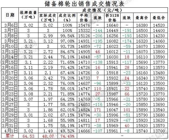 4月1日儲備棉輪出銷售資源30158.778噸,實(shí)際成交14933.57噸,成交率49.52%。當(dāng)日最高成交價15740元/噸(2012年度新疆棉),最低成交價13700元/噸(2013年度地產(chǎn)棉)。成交平均價格14666元/噸(較前一日價格跌107元/噸);折3128價格:15961元/噸(較前一日價格跌8元/噸)。當(dāng)日單捆最高加價1800元/噸(2013年度新疆棉),單捆最低加價20元/噸(2012年度地產(chǎn)棉3捆,新疆棉4捆;2013年度地產(chǎn)棉2捆)。