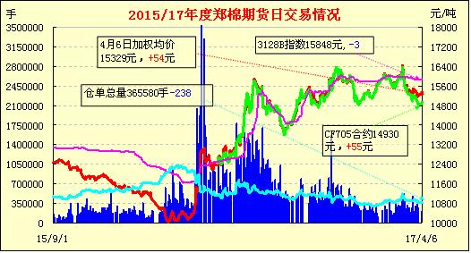 4月6日,隔夜鄭棉CF1709合約沖高后在平倉盤與空頭賣盤壓制下走低,今日早盤增倉下跌,午后低位震蕩,日線形成長上影線的陰線。日內成交量放大,持倉量增加?;久媲闆r:呈現調整,走貨相對不暢,好質量疆棉相對略好于地產棉。一企業(yè)南通庫疆棉手摘3130級強力27報價在16100元/噸公定自提。因鄭棉主力合約轉換,部分商家倉單棉銷售參考基準價從1705合約結算+300轉向1709合約結算-500,然后再考慮重量溢短及質量升貼水。今有商談成交在基差-340-500左右。
