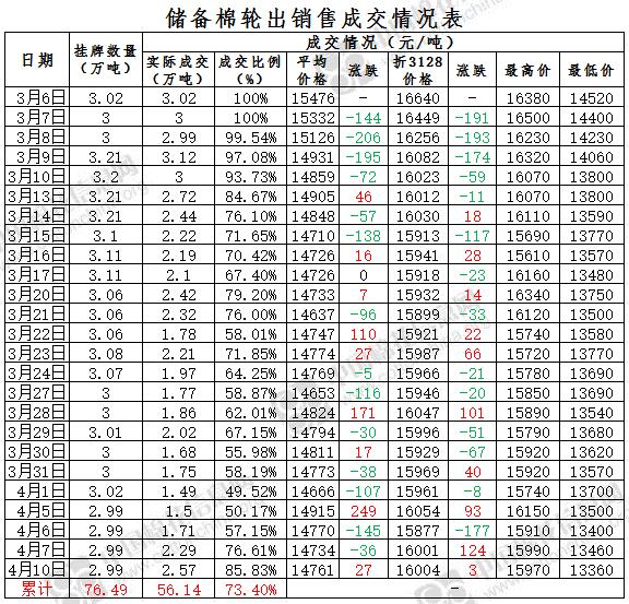 4月10日儲備棉輪出銷售資源29897.278噸,實際成交25660.009噸,成交率85.83%。當(dāng)日最高成交價15970元/噸(2012年度新疆棉),最低成交價13360元/噸(2013年度地產(chǎn)棉)。成交平均價格14761元/噸(較前一日價格漲27元/噸);折3128價格:16003元/噸(較前一日價格漲3元/噸)。當(dāng)日單捆最高加價2280元/噸(2013年度新疆棉),單捆最低加價20元/噸(2011年度地產(chǎn)棉1捆;2012年度地產(chǎn)棉3捆;2013年度地產(chǎn)棉6捆,新疆棉1捆)。