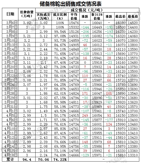 4月18日儲備棉輪出銷售資源29951.834噸,實際成交22370.285噸,成交率74.69%。當(dāng)日最高成交價15810元/噸(2012年度新疆棉),最低成交價13310元/噸(2013年度地產(chǎn)棉)。成交平均價格14666元/噸(較前一日價格跌129元/噸);折3128價格:15971元/噸(較前一日價格跌21元/噸)。當(dāng)日單捆最高加價1520元/噸(2013年度新疆棉),單捆最低加價20元/噸(2011年度地產(chǎn)棉5捆;2012年度地產(chǎn)棉7捆;2013年度地產(chǎn)棉6捆)。