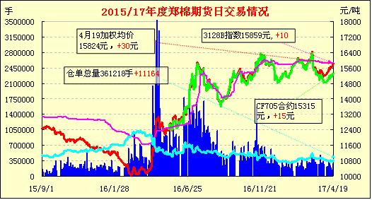 4月19日鄭棉CF1709合約早盤受到平倉(cāng)盤打壓下滑,隨后多頭買盤推動(dòng)期價(jià)回升,尾盤收于日高一線,日線形成長(zhǎng)下影線的陽線。日內(nèi)成交量萎縮,持倉(cāng)量增加?;久媲闆r:全棉紗的32s、21s依然動(dòng)銷,例如,全棉紗的32s目前主要用于噴氣織造富貴紡面料,目前全棉紗價(jià)格走勢(shì)平穩(wěn)偏弱。滌棉紗行情比較平靜,產(chǎn)品價(jià)格走勢(shì)變化不大。滌粘紗等混紡紗市場(chǎng)行情略有變化,市場(chǎng)上成交量甚少。人棉紗市場(chǎng)10s、30s銷售量尚可,產(chǎn)品價(jià)格維持平穩(wěn)。粘膠短纖價(jià)格穩(wěn)定,市場(chǎng)上均價(jià)在15550元/T左右。純滌紗市場(chǎng)報(bào)價(jià)平穩(wěn)狀態(tài),純滌紗45s交易量也可以,主要是用于生產(chǎn)滌棉里料系列。滌綸短纖價(jià)格走勢(shì)維穩(wěn),規(guī)格為1.4D×38mm的市場(chǎng)中心價(jià)格在7650元/噸左右。預(yù)計(jì)后市純滌紗的行情將有適度調(diào)整的趨勢(shì)。