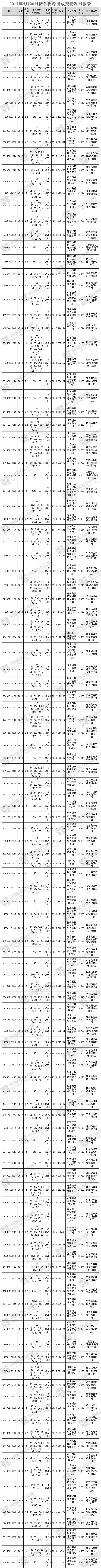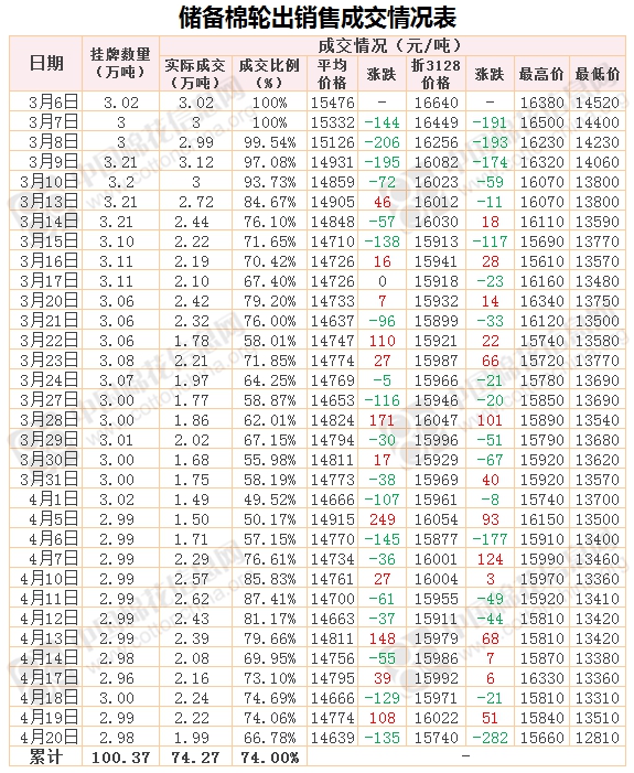 4月20日儲備棉輪出銷售資源29761.271噸,實際成交19875.045噸,成交率66.78%。當(dāng)日最高成交價15660元/噸(2012年度新疆棉),最低成交價12810元/噸(2013年度地產(chǎn)棉)。成交平均價格14639元/噸(較前一日價格跌135元/噸);折3128價格:15740元/噸(較前一日價格跌282元/噸)。當(dāng)日單捆最高加價1620元/噸(2013年度新疆棉),單捆最低加價20元/噸(2011年度地產(chǎn)棉1捆;2012年度地產(chǎn)棉14捆,新疆棉1捆;2013年度地產(chǎn)棉13捆)。