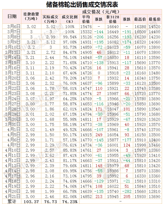 4月21日儲(chǔ)備棉輪出銷售資源29999.336噸,實(shí)際成交24617.025噸,成交率82.06%。當(dāng)日最高成交價(jià)15930元/噸(2012年度新疆棉),最低成交價(jià)13690元/噸(2012年度地產(chǎn)棉)。成交平均價(jià)格14852元/噸(較前一日價(jià)格漲213元/噸);折3128價(jià)格:15945元/噸(較前一日價(jià)格漲205元/噸)。當(dāng)日單捆最高加價(jià)2260元/噸(2012年度新疆棉),單捆最低加價(jià)20元/噸(2011年度地產(chǎn)棉1捆;2012年度地產(chǎn)棉7捆;2013年度地產(chǎn)棉7捆)。
