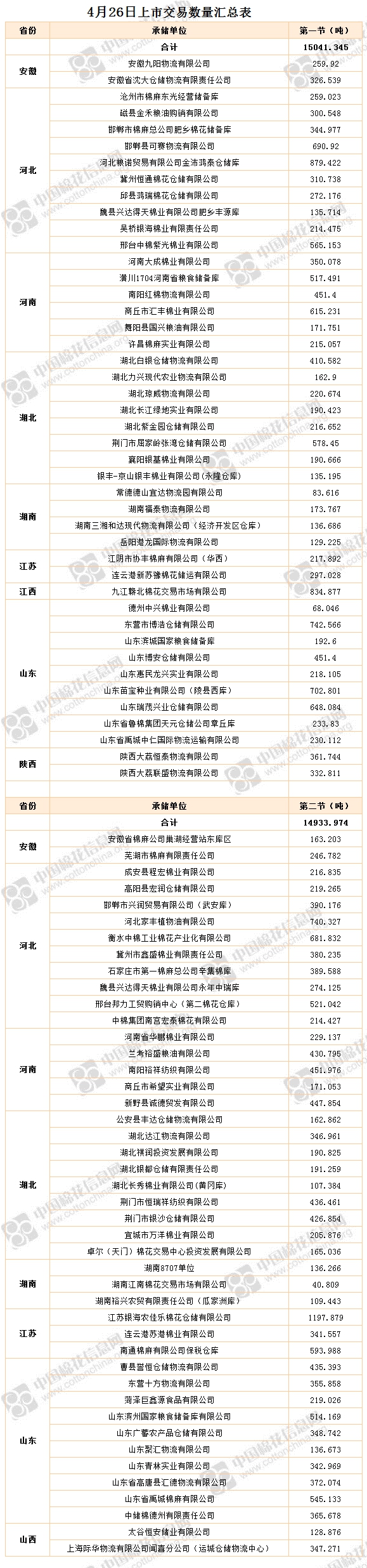 4月26日兩節(jié)共計(jì)輪出儲(chǔ)備棉29975.319噸。