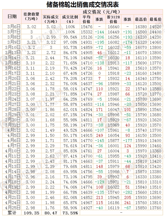 4月25日儲備棉輪出銷售資源29828.4644噸,實際成交17569.062噸,成交率58.90%。當(dāng)日最高成交價15850元/噸(2013年度新疆棉),最低成交價13830元/噸(2013年度地產(chǎn)棉)。成交平均價格14927元/噸(較前一日價格跌40元/噸);折3128價格:16119元/噸(較前一日價格跌67元/噸)。當(dāng)日單捆最高加價1680元/噸(2013年度新疆棉),單捆最低加價20元/噸(2011年度地產(chǎn)棉1捆;2012年度地產(chǎn)棉11捆;2013年度地產(chǎn)棉8捆)。