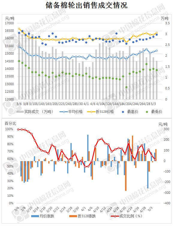 5月4日儲備棉輪出銷售資源29932.915噸,實際成交17658.6噸,成交率58.99%。當(dāng)日最高成交價16250元/噸(2012年度新疆棉),最低成交價13930元/噸(2013年度地產(chǎn)棉)。成交平均價格15214元/噸(較前一日價格漲80元/噸);折3128價格:16364元/噸(較前一日價格漲114元/噸)。當(dāng)日單捆最高加價1940元/噸(2012年度新疆棉),單捆最低加價20元/噸(2012年度地產(chǎn)棉7捆;2013年度地產(chǎn)棉11捆)。