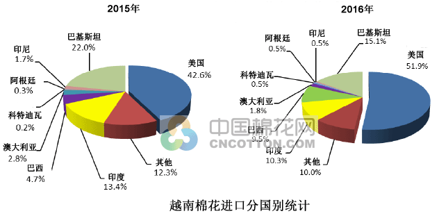 目前過(guò)去十年美棉一直是越南棉花進(jìn)口最大來(lái)源。2016年美國(guó)對(duì)越南出口棉花53.7萬(wàn)噸,貨值7.863億美元,同比增長(zhǎng)分別24.3%、26.3%,美棉占越南棉花進(jìn)口比重從2015年的42.6%提高到52%。2016年只有美國(guó)、澳大利亞對(duì)越南棉花出口正增長(zhǎng),其他品種則全面減少。