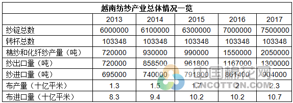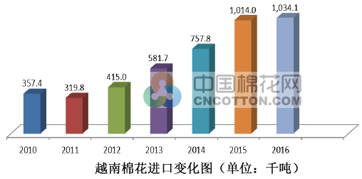 未來(lái)越南棉花消費(fèi)增速仍將是最快的,棉花進(jìn)口將繼續(xù)增加。中國(guó)、土耳其、韓國(guó)對(duì)越南紗需求非常旺盛,有力地刺激越南棉花進(jìn)口。2016年越南進(jìn)口棉花103萬(wàn)噸,同比增長(zhǎng)2%,預(yù)計(jì)2017年進(jìn)口將增長(zhǎng)10%。