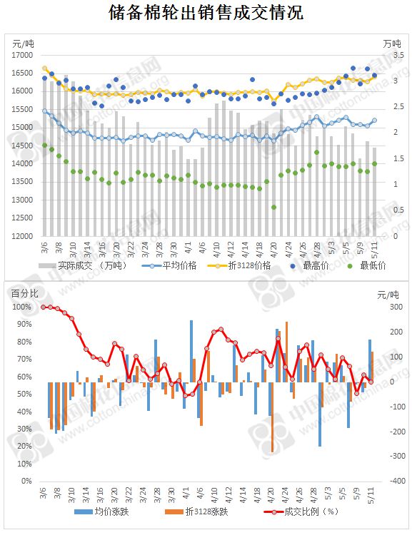 5月11日儲(chǔ)備棉輪出銷(xiāo)售資源29924.032噸,實(shí)際成交17115.498噸,成交率57.20%。當(dāng)日最高成交價(jià)16450元/噸(2012年度新疆棉),最低成交價(jià)14000元/噸(2013年度地產(chǎn)棉)。成交平均價(jià)格15216元/噸(較前一日價(jià)格漲170元/噸);折3128價(jià)格:16406元/噸(較前一日價(jià)格漲123元/噸)。當(dāng)日單捆最高加價(jià)1700元/噸(2013年度新疆棉),單捆最低加價(jià)20元/噸(2012年度地產(chǎn)棉4捆,新疆棉1捆;2013年度地產(chǎn)棉1捆)。