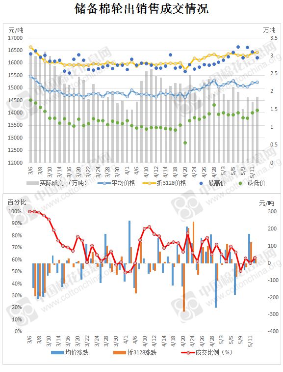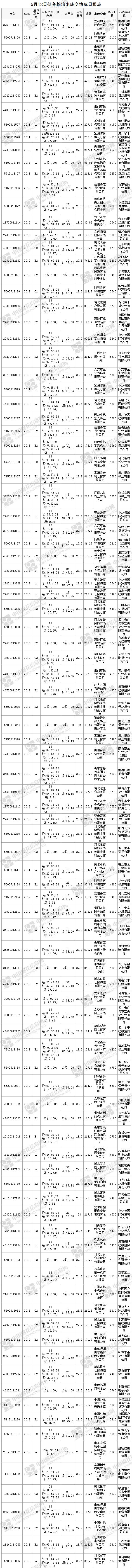 5月12日儲(chǔ)備棉輪出銷售資源29960.876噸,實(shí)際成交18487.022噸,成交率61.70%。當(dāng)日最高成交價(jià)16220元/噸(2012年度新疆棉),最低成交價(jià)14100元/噸(2013年度地產(chǎn)棉)。成交平均價(jià)格15238元/噸(較前一日價(jià)格漲22元/噸);折3128價(jià)格:16432元/噸(較前一日價(jià)格漲26元/噸)。當(dāng)日單捆最高加價(jià)1780元/噸(2013年度新疆棉),單捆最低加價(jià)20元/噸(2012年度地產(chǎn)棉4捆;2013年度地產(chǎn)棉5捆)。