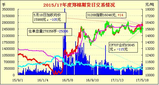 5月18日隔夜鄭棉盤整,今日早盤在平倉(cāng)盤壓制下走低,隨后弱市震蕩,尾盤平倉(cāng)盤再涌,期價(jià)收于日低一線,日線形成長(zhǎng)陰線。日內(nèi)成交量放大,持倉(cāng)量減少?;久媲闆r:棉花現(xiàn)貨市場(chǎng)平穩(wěn)運(yùn)行,山東、河北等地雙28級(jí)南疆手摘棉倉(cāng)庫(kù)提貨價(jià)格在16700-16800元/噸毛重,實(shí)際成交不多,賣家堅(jiān)挺及紡企略抵觸,雙方顯僵持狀態(tài)。