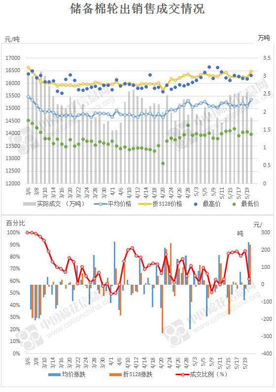 5月22日儲(chǔ)備棉輪出銷售資源29946.847噸,實(shí)際成交18445.814噸,成交率61.60%。當(dāng)日最高成交價(jià)16310元/噸(2012年度新疆棉),最低成交價(jià)13980元/噸(2011年度地產(chǎn)棉)。成交平均價(jià)格15346元/噸(較前一日價(jià)格漲245元/噸);折3128價(jià)格:16474元/噸(較前一日價(jià)格漲231元/噸)。當(dāng)日單捆最高加價(jià)1340元/噸(2012年度新疆棉),單捆最低加價(jià)20元/噸(2012年度地產(chǎn)棉8捆;2013年度地產(chǎn)棉2捆)。