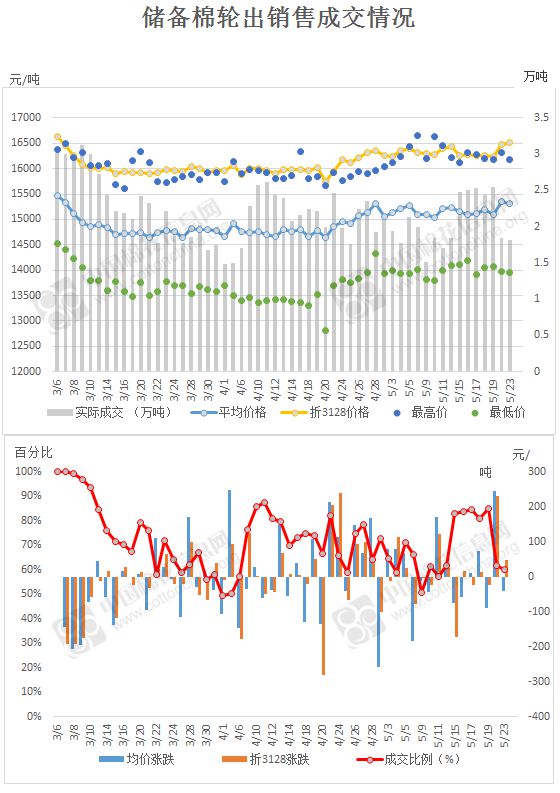 截至5月23日,2016年度儲備棉輪出累計成交120萬噸,成交率72.2%。