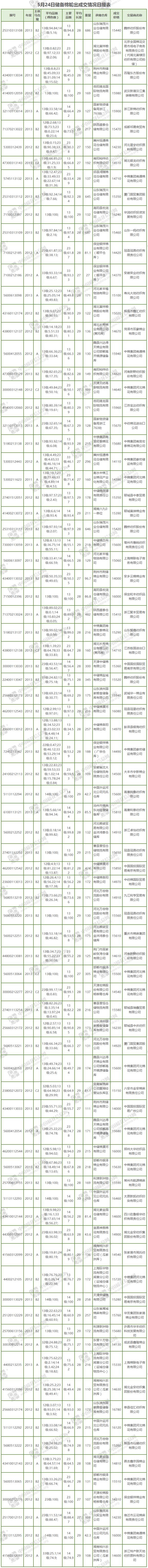 5月24日儲(chǔ)備棉輪出銷售資源30191.858噸,實(shí)際成交16058.026噸,成交率53.19%。當(dāng)日最高成交價(jià)16780元/噸(2012年度新疆棉),最低成交價(jià)14000元/噸(2013年度地產(chǎn)棉)。成交平均價(jià)格15320元/噸(較前一日價(jià)格漲14元/噸);折3128價(jià)格:16536元/噸(較前一日價(jià)格漲13元/噸)。當(dāng)日單捆最高加價(jià)1500元/噸(2013年度新疆棉),單捆最低加價(jià)20元/噸(2012年度地產(chǎn)棉5捆;2013年度地產(chǎn)棉4捆)。紡織企業(yè)家數(shù)占比:44.26%,非紡織企業(yè)家數(shù)占比:55.74%。