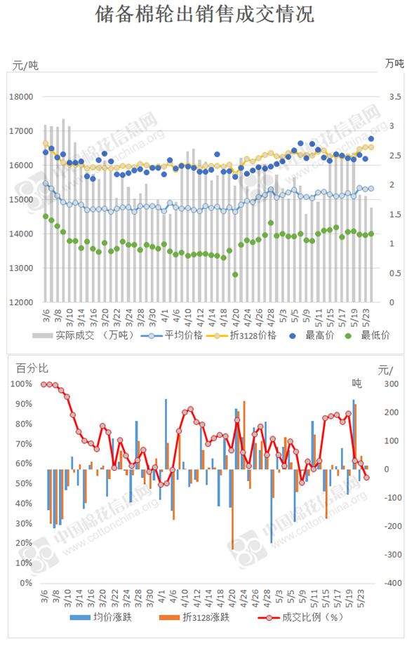 截至5月24日,2016年度儲(chǔ)備棉輪出累計(jì)成交121.7萬(wàn)噸,成交率71.86%。