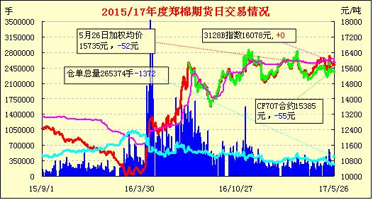 5月26日隔夜鄭棉橫盤,今日盤中震蕩回落,尾盤反彈,日線形成小陰線。日內(nèi)成交量變化不大,持倉量略有減少?;久媲闆r:2017年6月中國棉花進出口關(guān)稅匯率調(diào)整為6.8635。價格略有陰跌,商家反映價格下調(diào)后成交尚可,阿克蘇等地3128/29級手摘疆棉價16000-16100元/噸,實際商談優(yōu)惠。而低等級棉花走弱相對明顯,喀什等地2227級提貨價在15100-15200元/噸毛重,跌幅百元,且商談仍有優(yōu)惠。長絨棉市場延續(xù)堅挺,價格重心上移,但整體成交量出現(xiàn)了下滑,目前資源多集中在大型商家及紡企手中,阿克蘇等地137級出庫價格在21600-21700元/噸毛重,河南等地出庫價格在22300-23400元/噸。且據(jù)悉,部分商家目前一周僅出貨2-3批。