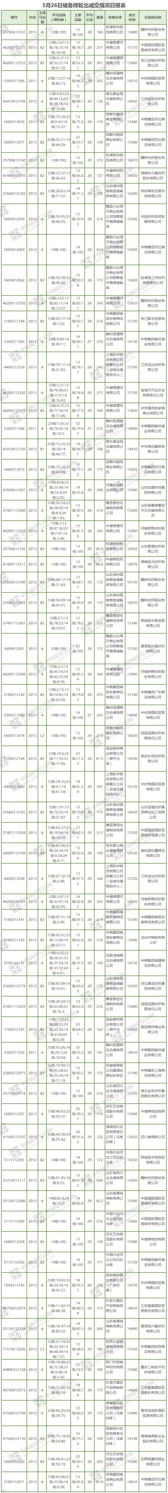 5月26日儲備棉輪出銷售資源29512.313噸,實際成交13720.305噸,成交率46.49%。當(dāng)日最高成交價16430元/噸(2012年度新疆棉),最低成交價13620元/噸(2012年度地產(chǎn)棉)。成交平均價格15318元/噸(較前一日價格跌147元/噸);折3128價格:16519元/噸(較前一日價格跌101元/噸)。當(dāng)日單捆最高加價1240元/噸(2012年度新疆棉),單捆最低加價20元/噸(2012年度地產(chǎn)棉6捆;2013年度地產(chǎn)棉2捆)。紡織企業(yè)家數(shù)占比:44.19%,非紡織企業(yè)家數(shù)占比:55.81%。