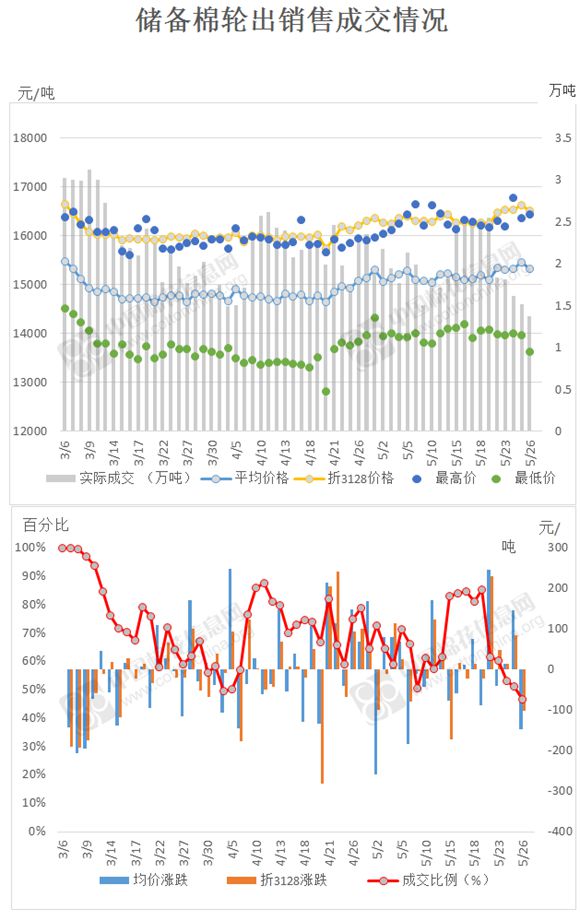 2017年3月6日至5月26日,儲備棉輪出累計成交124.5萬噸,成交率71.08%。