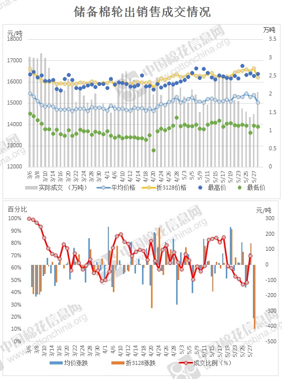 2017年3月6日至5月31日,儲(chǔ)備棉輪出累計(jì)成交128萬(wàn)噸,成交率70.7%。