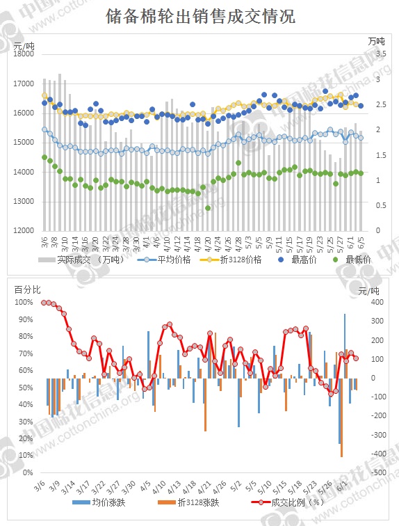 2017年3月6日至6月5日,儲(chǔ)備棉輪出累計(jì)成交134萬噸,成交率70.56%。