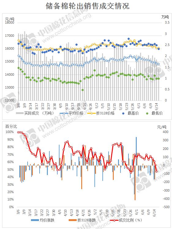 2017年3月6日至6月15日,儲備棉輪出累計成交149萬噸,成交率69.72%。