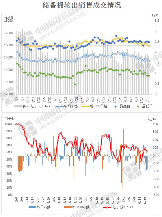 2017年3月6日至6月20日,儲(chǔ)備棉輪出累計(jì)成交155萬(wàn)噸,成交率69.46%。