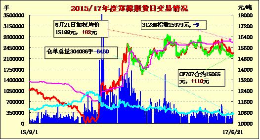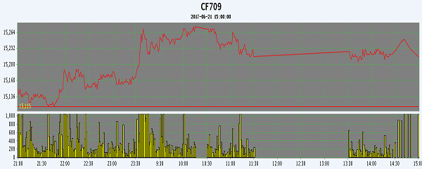 6月21日隔夜鄭棉探低回升,今日早盤沖高回落,CF1709合約日線形成陽線,CF1801合約日線形成小陰線。日內(nèi)成交量萎縮,持倉量近減遠(yuǎn)增。基本面情況:現(xiàn)貨市場有小幅回落,山東、河北等地3128級地產(chǎn)價格在15100-15200元/噸,實(shí)際商談仍有優(yōu)惠。而好質(zhì)量疆棉市場價格相對維持,阿克蘇等地雙28、雙29級手摘提貨價格在15900-16100元/噸毛重,商談小幅優(yōu)惠。整體市場看淡氣氛增濃。