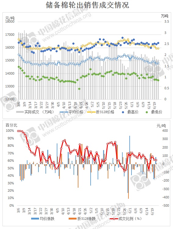 2017年3月6日至6月21日,儲備棉輪出累計成交157萬噸,成交率69.35%。