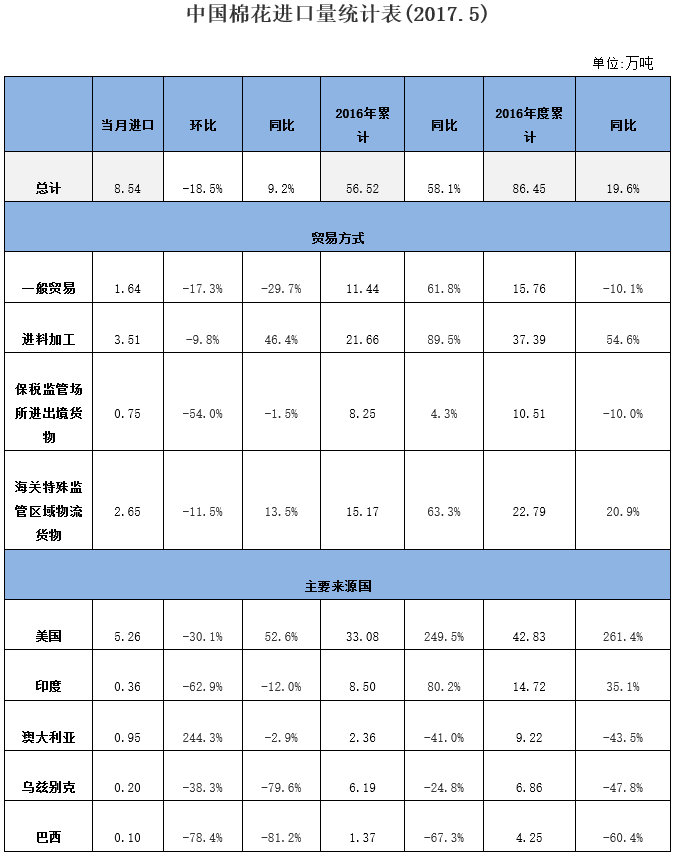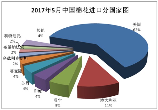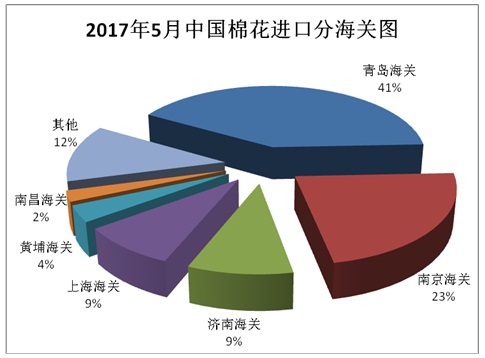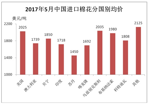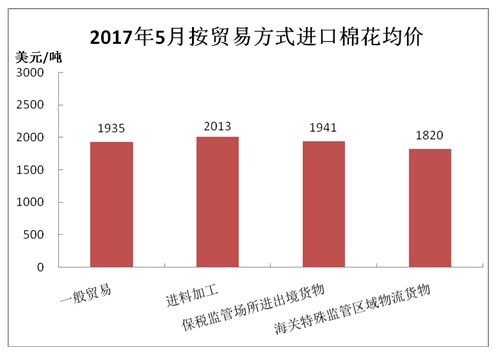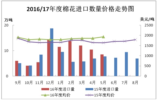 據(jù)海關(guān)統(tǒng)計(jì),2017年5月我國(guó)棉花進(jìn)口8.54萬噸,環(huán)比下降18.5%,同比增長(zhǎng)9.2%;平均進(jìn)口價(jià)格1932美元/噸,較4月上漲74美元,漲幅3.9%,同比上漲17.6%。2017年前5個(gè)月累計(jì)進(jìn)口56.52萬噸,同比增長(zhǎng)58.1%。2016/17年度前9個(gè)月累計(jì)進(jìn)口86.45萬噸,同比增長(zhǎng)19.6%。