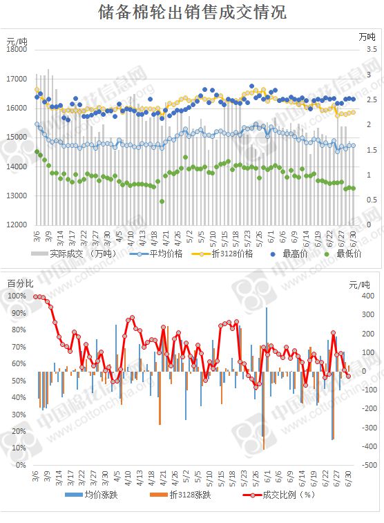 2017年3月6日至6月30日,儲備棉輪出累計成交169萬噸,成交率68.62%。