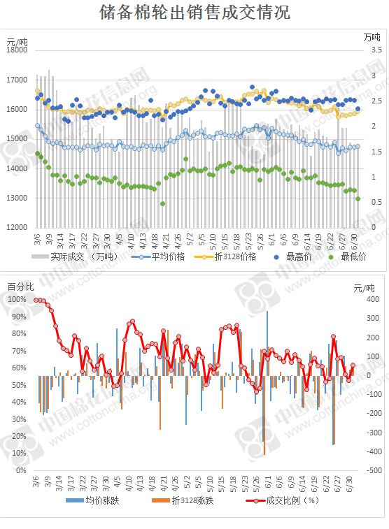 2017年3月6日至7月3日,儲(chǔ)備棉輪出累計(jì)成交171萬噸,成交率68.55%。