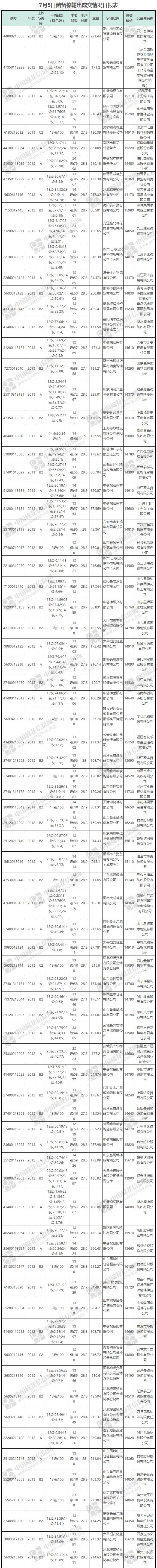 7月5日儲備棉輪出銷售資源30005.774噸,實際成交13204.329噸,成交率44.01%。當(dāng)日最高成交價16370元/噸(2012年度新疆棉),最低成交價13580元/噸(2012年度地產(chǎn)棉)。成交平均價格15003元/噸(較前一日價格漲97元/噸);折3128價格:16105元/噸(較前一日價格漲103元/噸)。當(dāng)日單捆最高加價1860元/噸(2012年度新疆棉),單捆最低加價20元/噸(2012年度地產(chǎn)棉3捆,2013年度地產(chǎn)棉8捆)。紡織企業(yè)家數(shù)占比:56.90%,非紡織企業(yè)家數(shù)占比:43.10%。