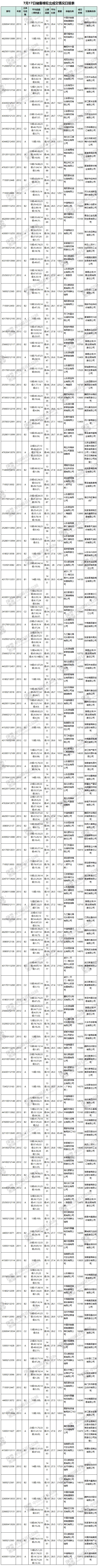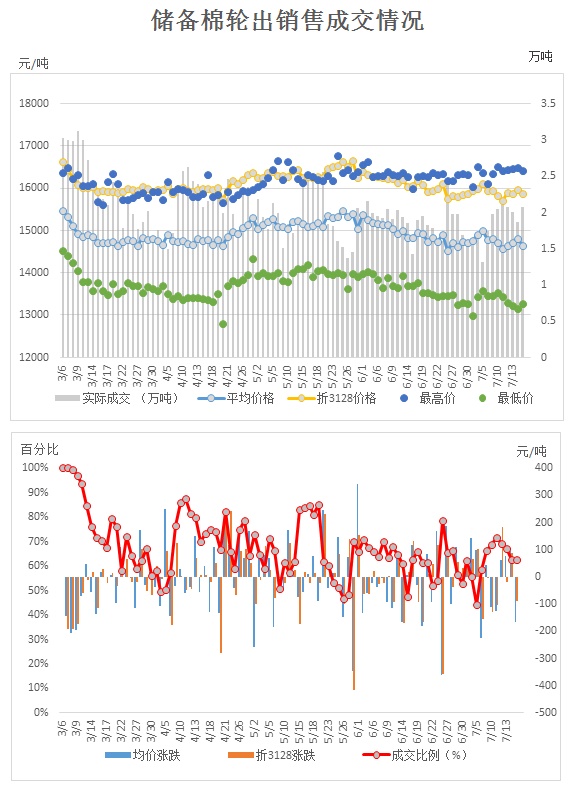 7月17日儲備棉輪出銷售資源30051.769噸,實際成交20701.894噸,成交率62.63%。當日最高成交價16410元/噸(2013年度新疆棉),最低成交價13270元/噸(2012年度地產(chǎn)棉)。成交平均價格14642元/噸(較前一日價格跌168元/噸);折3128價格:15874元/噸(較前一日價格跌89元/噸)。當日單捆最高加價2380元/噸(2013年度新疆棉),單捆最低加價20元/噸(2012年度地產(chǎn)棉8捆,2013年度地產(chǎn)棉5捆)。紡織企業(yè)家數(shù)占比:53.25%,非紡織企業(yè)家數(shù)占比:46.75%。