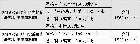 第一條細(xì)則變更主要是確立新疆作為國(guó)內(nèi)棉花的定價(jià)中心和交割基準(zhǔn)地,CF1709和CF1801分別代表新老劃斷下的合約,這條交割新規(guī)帶來(lái)倉(cāng)單注冊(cè)成本的變化。如下表所示,對(duì)同樣質(zhì)量等級(jí)的新疆棉在新舊規(guī)則下倉(cāng)單的注冊(cè)成本分別進(jìn)行核算,CF1801倉(cāng)單注冊(cè)成本要比CF1709低約400元/噸。
