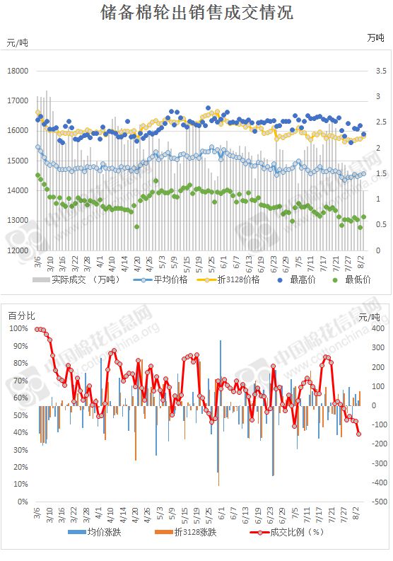 2017年3月6日至8月3日,儲(chǔ)備棉輪出累計(jì)成交213.49萬(wàn)噸,成交率67.04%。