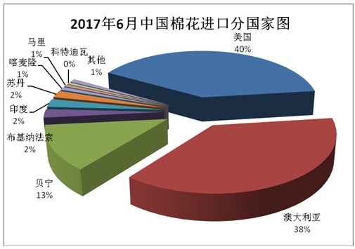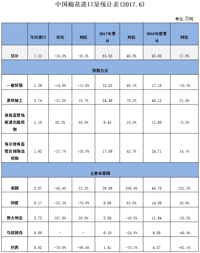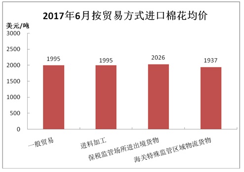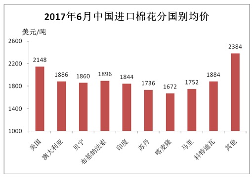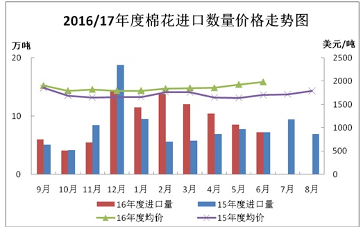 據(jù)海關(guān)統(tǒng)計(jì),2017年6月我國棉花進(jìn)口7.23萬噸,環(huán)比下降15.3%,同比減少0.1%;平均進(jìn)口價(jià)格1985美元/噸,較5月上漲53美元,漲幅2.8%,同比上漲16.5%。2017年上半年累計(jì)進(jìn)口63.85萬噸,同比增長48.1%。2016/17年度前10個月累計(jì)進(jìn)口93.68萬噸,同比增長17.8%。