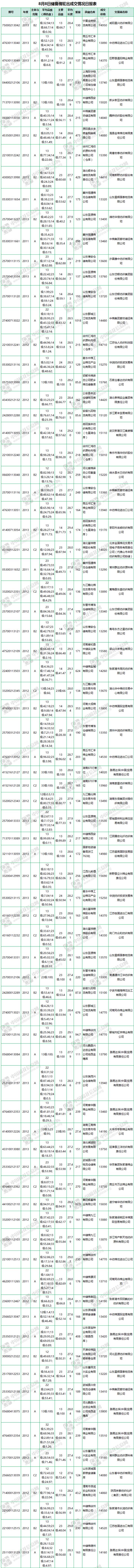 8月8日儲備棉輪出銷售資源29594.7356噸,實際成交24423.5516噸,成交率82.53%。當日最高成交價15940元/噸(2012年度新疆棉),最低成交價13180元/噸(2012年度地產(chǎn)棉)。成交平均價格14216元/噸(較前一日價格跌96元/噸);折3128價格:15316元/噸(較前一日價格跌32元/噸)。當日單捆最高加價2640元/噸(2013年度新疆棉),單捆最低加價20元/噸(2012年度地產(chǎn)棉9捆;2012年度新疆棉1捆,2013年度地產(chǎn)棉14捆)。紡織企業(yè)家數(shù)占比:60.26%,非紡織企業(yè)家數(shù)占比:39.74%。