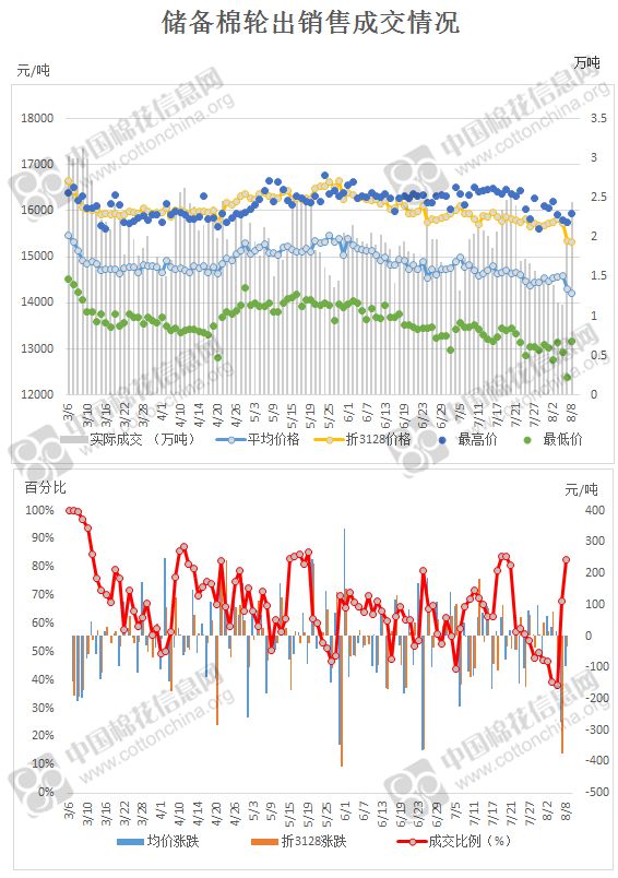 2017年3月6日至8月8日,儲備棉輪出累計成交219.09萬噸,成交率66.92%。