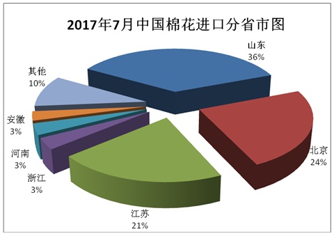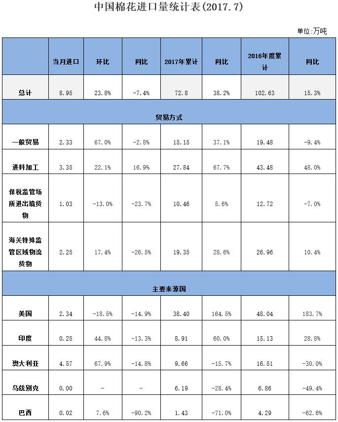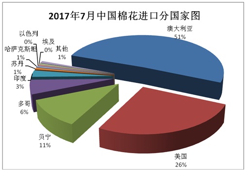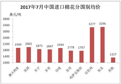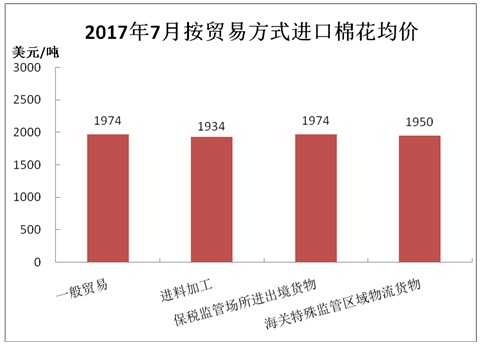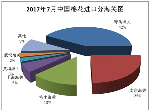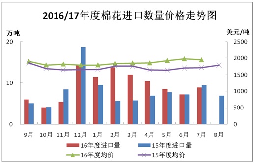 據(jù)海關(guān)統(tǒng)計,2017年7月我國進(jìn)口棉花8.95萬噸,環(huán)比增長23.8%,同比減少7.4%;平均進(jìn)口價格1953美元/噸,較6月下跌32美元,跌幅1.6%,同比上漲13.6%。2017年前7個月我國進(jìn)口棉花72.8萬噸,同比增長38.2%。2016/17年度前11個月我國累計進(jìn)口棉花102.63萬噸,同比增長15.3%。